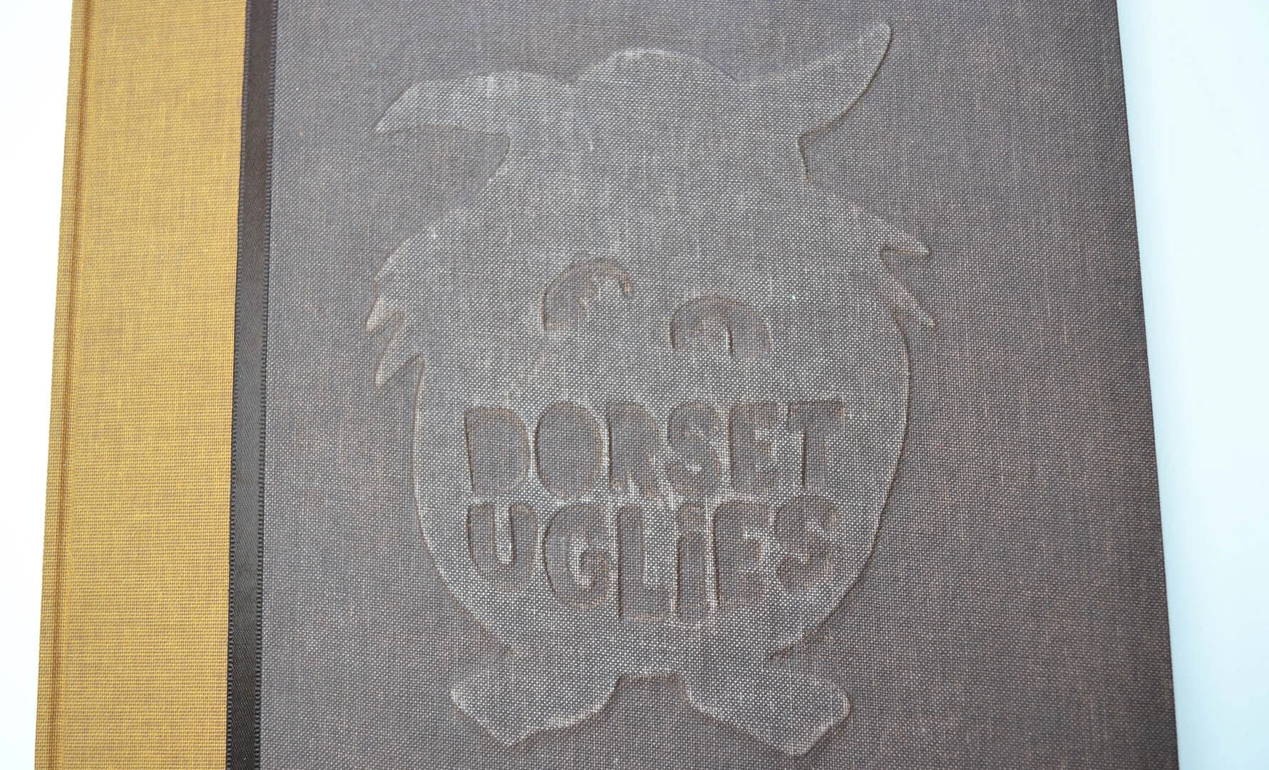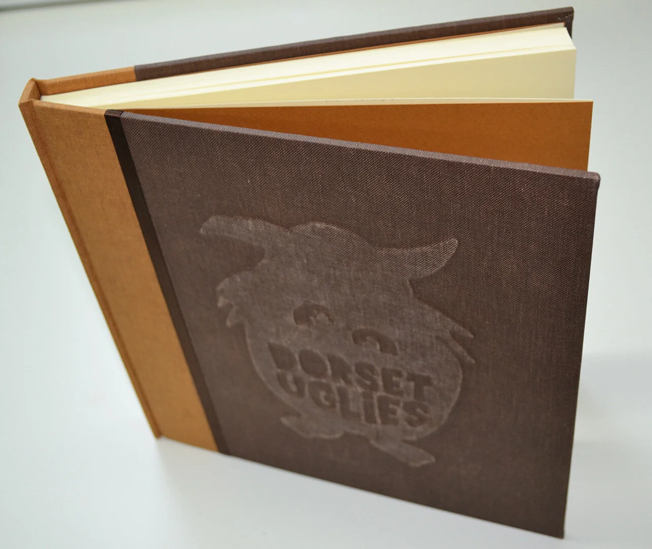 Stitched block, flat back binding with book-cloth to reflect the earthiness of the clay used in making the artwork. The logo was cut from thin board and adhered to the cover before covering. After completion the surface was very gently sanded to highlight the logo and further reflect clay.
